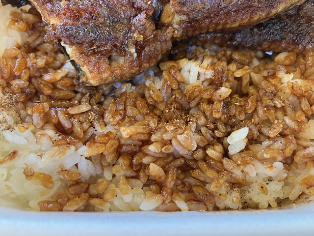 山椒はうなぎ直接ではなくご飯に。食してみると、見た目通りの肉厚感で、タレは甘めかつ濃いめ。ご飯粒が固めで、タレを吸った感じが丁度よくこたパパ好み。お弁当とはいえ、地焼の鰻は本当に美味かったのだ🤤。