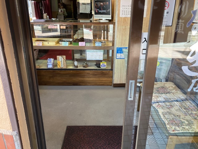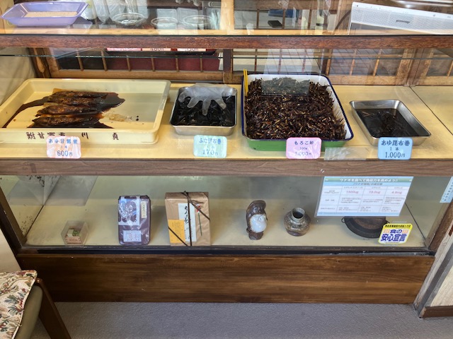 正面には小さなショーケースが設置されており、あゆの甘露煮や昆布巻きなどが陳列されているのだ🙂。