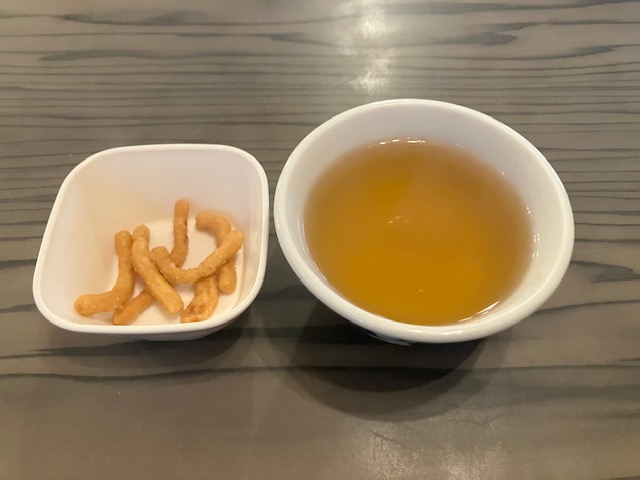 テーブルに案内されると、お茶と蕎麦菓子が提供されるのだ😃。