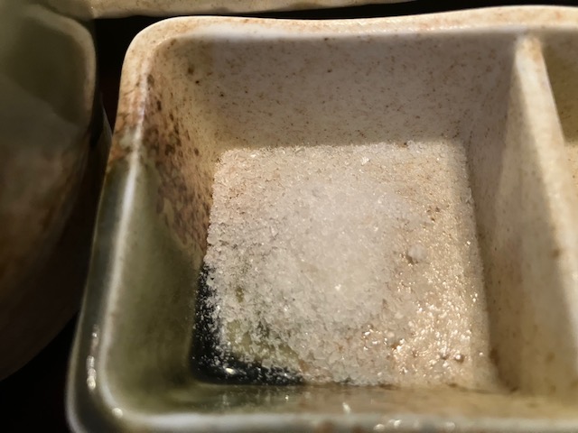 信州産石臼引き蕎麦の太さが少々不均一なところが良い感じ。またお蕎麦は少し短めかな。お店の方が「最初は是非お塩で」と言われたので頂いてみると、蕎麦の香りが立ち、かつ非常に甘くなるのだ。これには驚いたなぁ😄。