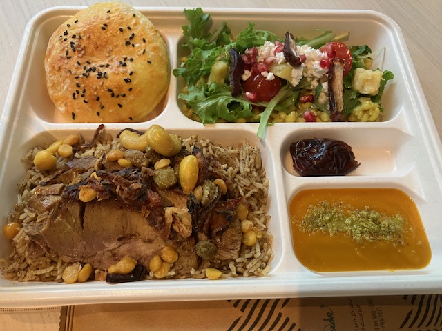実はこたパパのUAE館目的は「食事」なのだ。館内にはレストランが併設されており、本格的なアラブ料理が楽しめるのだ。入館不要でも利用可能だが、やはり万博大人気スポットの一つのため大行列。右側がテイクアウト、左側がイートインである。こたパパはもちろんイートインを選択。ちなみにここの待ち時間は80分だったな😅。