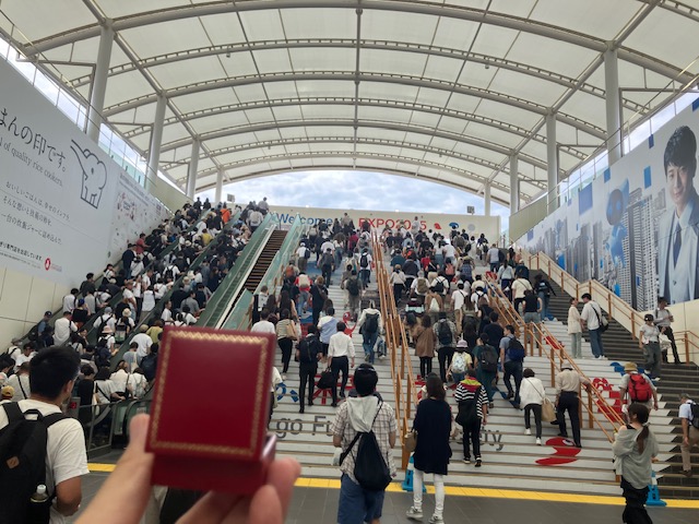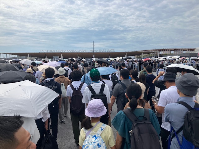 万博会場のある夢州駅は大変な混雑である。ちなみに今回は急遽訪問を決めたため、事前予約パビリオンはなしで、かつ入場時間も12:00以降からしか選択できなかったのだ😅。