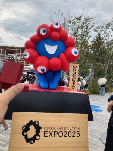 万博会場に入ると、メインキャラクターのミャクミャクがお出迎え。最初は気持ち悪いとか散々な評判だったが、今や大人気キャラクターである😄。