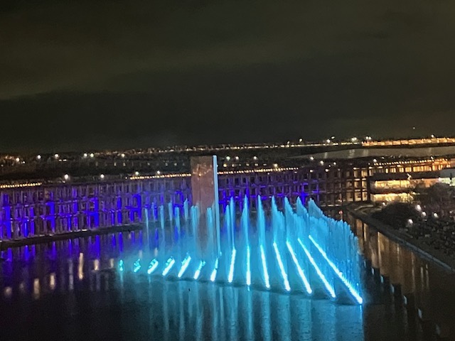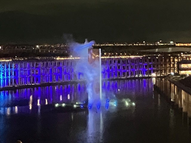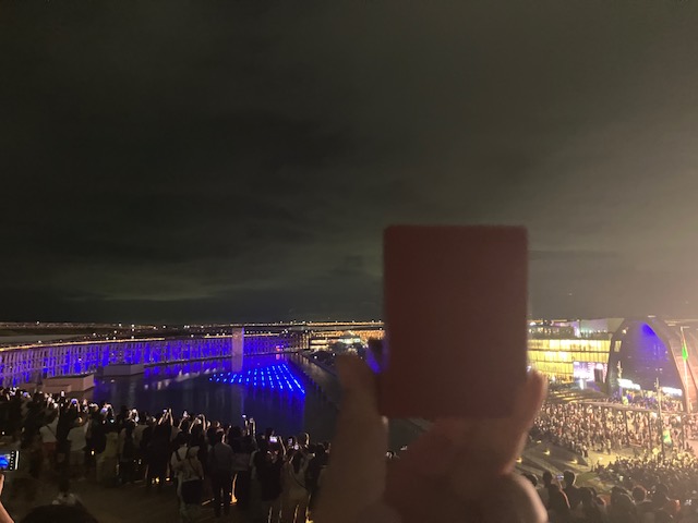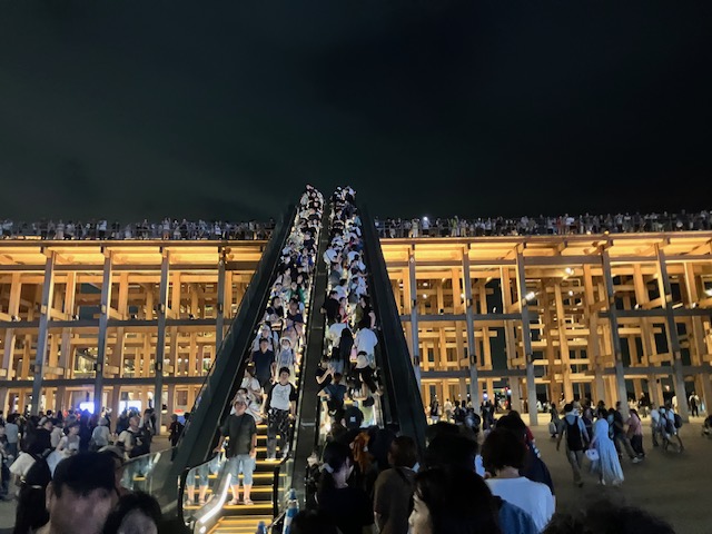 そして最後のイベントへ。「アオと夜の虹のパレード」という巨大噴水ショーである。これは大屋根リングの上からも鑑賞可能なのだ。ということで早速ライトアップされた大屋根リングの上へ🙂。