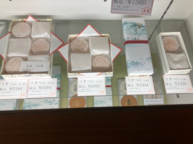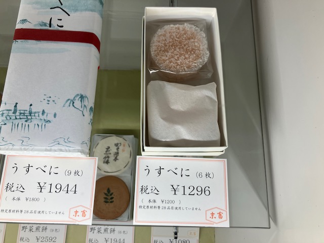 お店の方にお薦めをお伺いしたところ、昔からある代表銘菓は「うすべに」というお菓子とのこと。ということで今回こたパパは、最小サイズの「うすべに(6枚:1296円)」を一つ購入させて頂いたのだ😆。