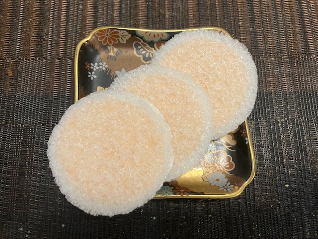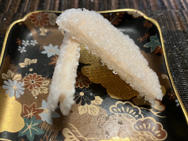 ほぼ透けて見えるほど薄い麩焼き煎餅で、ほんのり淡い色の梅肉あんを挟んだ、外観も美しい干菓子である😁。
