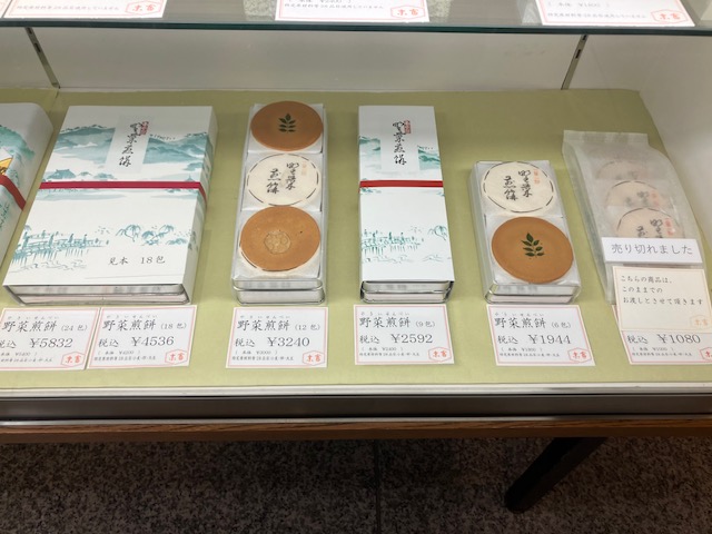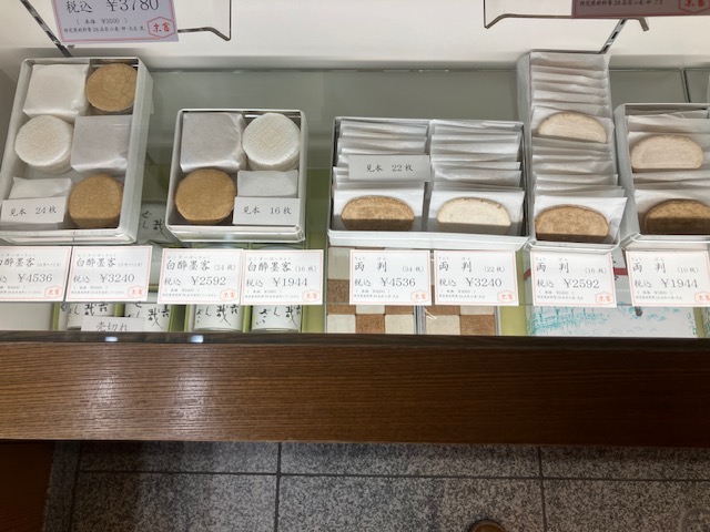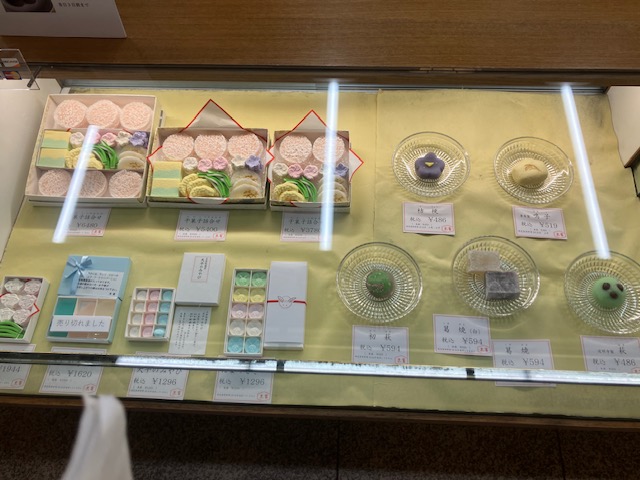 正面のメインショーケース内には、美しい干菓子と各種上生菓子、煎餅などと各種詰め合わせが陳列されているのだ😄。