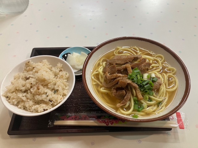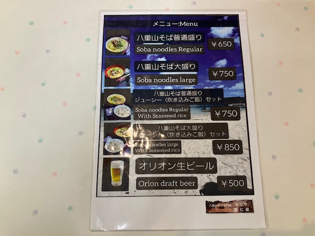 メニュー表。沖縄らしい南国風。もちろん注文するのは「八重山そば」だが、なんとわずか100円増でジューシー(炊き込みご飯)セットになるようだ。ということで、今回こたパパは、「八重山そばジューシーセット(750円)」を注文させて頂いたのだ😆。