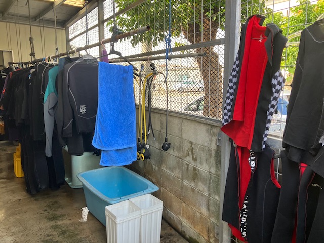 駐車場の横スペースでは、すごい量のウェットスーツが干されていたな😲。