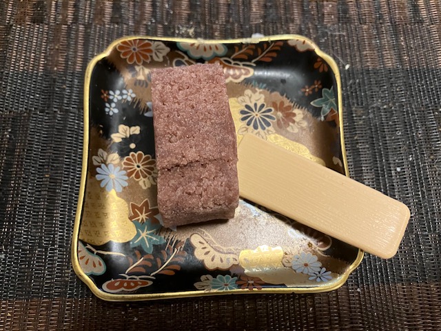 切ってみた感じ。食してみると、外側の村雨餡は甘さ控えめで口の中でほどけるように溶け、中の新栗の存在感と美味しさが際立つ一品。非常に珍しいタイプの美味しい栗羊羹なのだ🤤。
