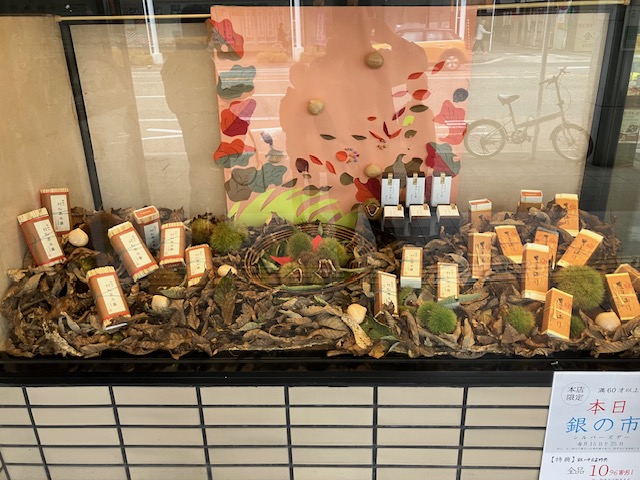 こちらのお店のショーウィンドウ内落葉ディスプレイは印象的だなぁ😁。