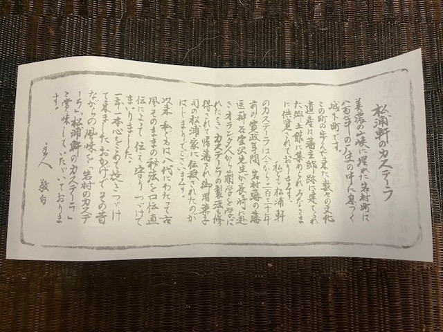 同封されている商品説明書き。江戸寛政期において岩村藩の御殿医であった「神谷雲澤」という方が、長崎に行かれた際にオランダ人から製法を学び、岩村に持ち帰ったものを、藩の御用菓子司だった松浦家が受け継いだのが始まりなのだ😲。