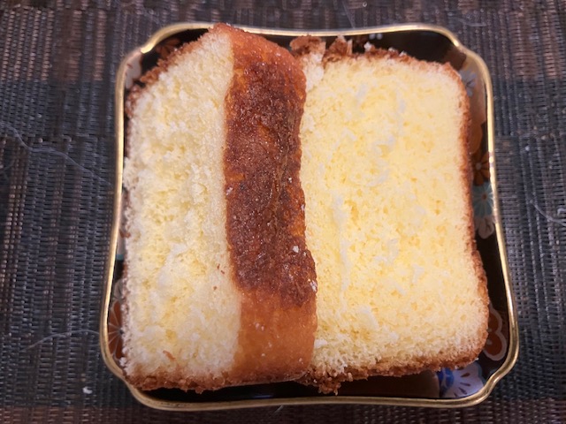 切ってみた感じ。食してみるとやはり一般的な長崎のカステラより水分少なめで、パウンドケーキに近い食感。こちらのカステーラは水飴が使われておらず、卵と蜂蜜の優しい甘さが感じられるのだ。牛乳と一緒に頂くとより美味しさが増す感じ。この素朴な美味さは、北海道旭川市にある高橋製菓さんの「ビタミンカステーラ」と少し似た雰囲気もあるなぁ🤤。