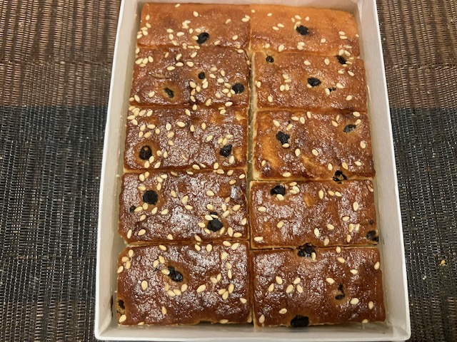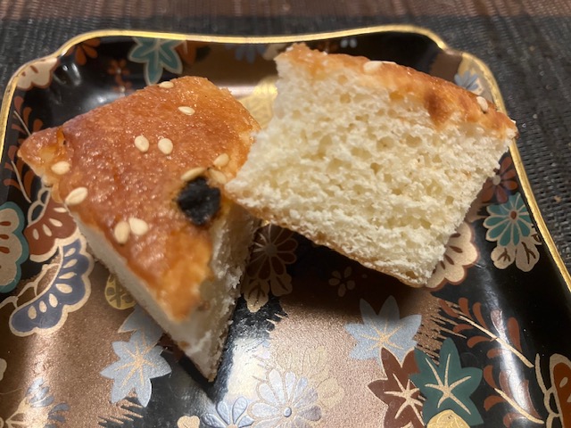 切ってみた感じ。ちなみに黒い粒は自家製大徳寺納豆である。見た目はカステラにも少し似ているが、食してみると全く異なる食感。生地はもっちりしっとりで、大徳寺納豆の塩味がお菓子全体の甘みを引き立てている感じ。白胡麻の風味とプチ食感がアクセント。白味噌の風味も相まって独特のくせになる美味しさなのだ🤤。