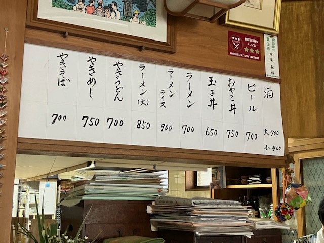 ご主人にお薦めをお伺いしたところ、一番人気は「ラーメン」とのこと。実はお店入口のすだれにもお手製の「ラーメン」看板が掲示されているのだ😁。