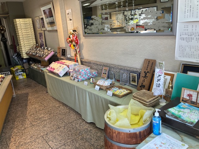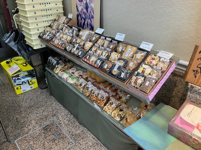 店内右手陳列台には、他社提携品おかきなど🙂。