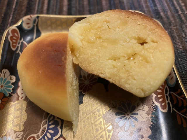 切ってみた感じ。食してみると焼き芋のようなほっくり感があり、優しい甘みで重くないのだ。添加物一切不要で全て手作り。かつてG7大阪堺貿易大臣会合で各国にも提供されたという、このお店を代表する逸品だったのだ😲。