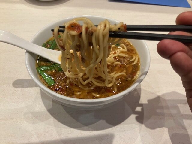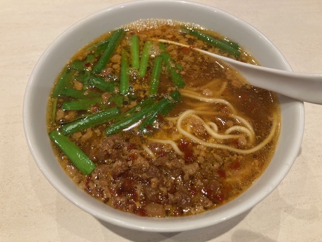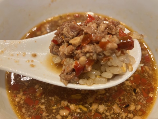 麺は中太ストレート。唐辛子とニンニクのパンチが効いたスープに、大量のニラと肉味噌(辣肉醬)の風味が押し寄せてくる感じ。かなり辛いのだが、猛烈な中毒性がある美味さなのだ🤤。