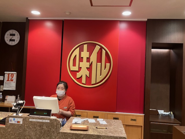 45分程行列に並んで入店。入口右手には真っ赤な壁面に金文字のロゴが印象的なレジスペース😁。
