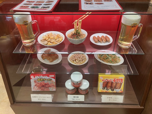 レジ下のショーケース内には、メイン商品の食品サンプル。最下段の中央にあるのが、こたパパが以前「ご飯のお供(愛知編)」で購入させて頂いた「辣肉醬(ラーロージャン)」である😄。
