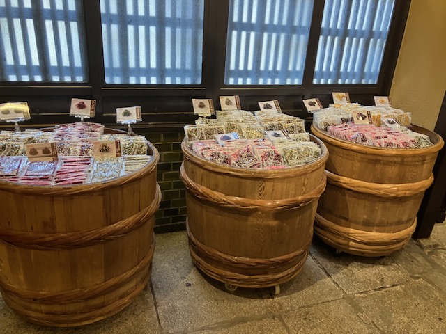 こちらは、漬物店でよく見られる樽陳列。多くの漬物がずらりと陳列されているのだ😄。