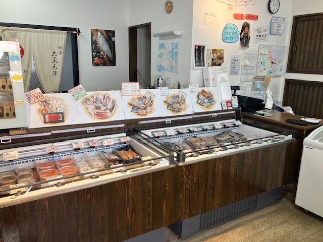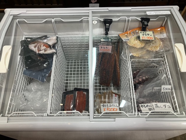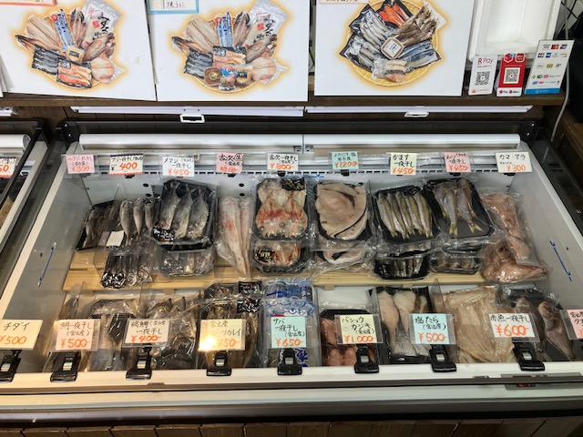冷蔵ケース内には、様々な種類の干物類や加工食品がずらりと陳列されているのだ😁。
