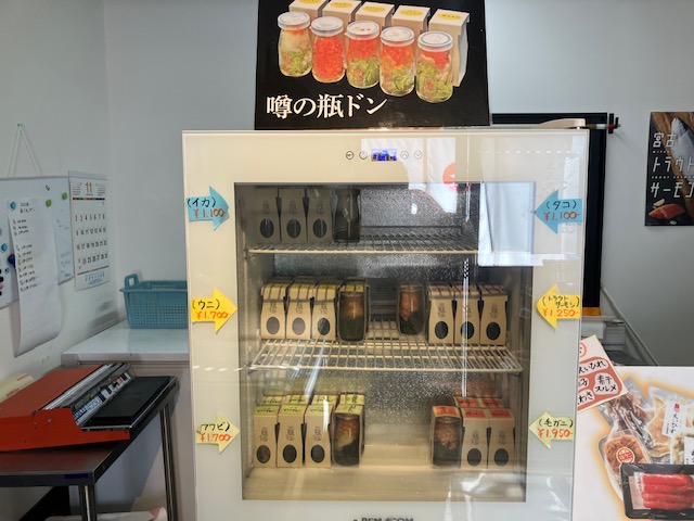 入口正面の小さな冷蔵ケース内には、ウニやイカ、アワビなどの海産物を瓶詰めした、「瓶ドン」という商品が陳列されているのだ。これは以前、ご飯のお供(岩手編)で頂いた、岩手県釜石市の中村屋さんの海宝miniという商品と近い感じがするなぁ😁。