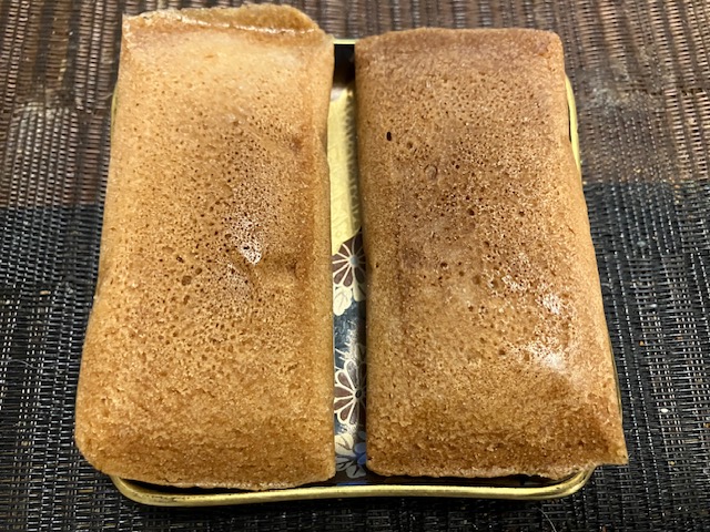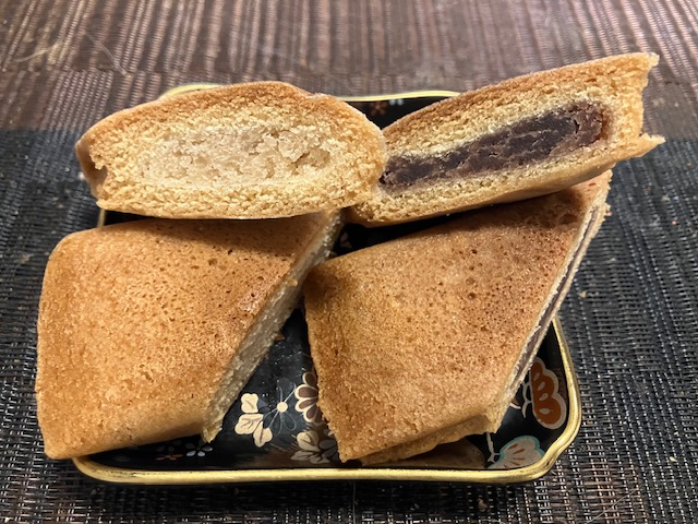 切ってみた感じ。しっとり系のカステラ生地で黒砂糖餡と白味噌餡を包んだ、洋菓子テイストも感じられるお菓子である。黒砂糖は沖縄波照間産、白味噌は京都から最上のものを取り寄せられていて、懐かしいながらも風味豊かな味わいなのだ🤤。