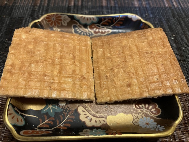 「格子煎餅」は一袋2枚入り。表面は正に格子模様。切断面に手作り感があるなぁ。食してみると、こちらは薄いのだがしっかりとパリ感があり、ピーナッツの存在感がかなり大きいのだ🤤。