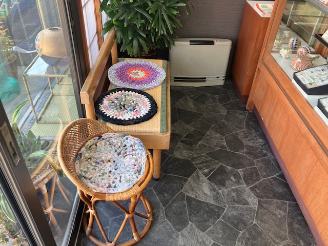 入口左手には、可愛らしい休憩椅子と畳ベンチ😄。