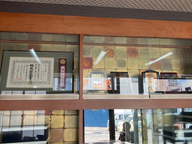 お店中央奥の壁面棚には過去受賞の賞状や盾などが展示されているのだ😄。