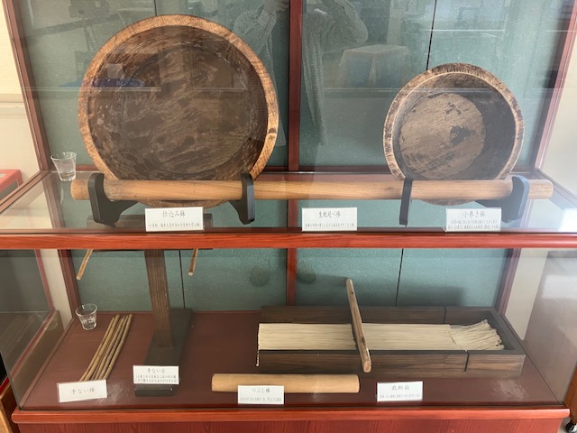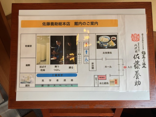 こちらは、稲庭うどんの製造工程。そして右側の壁面ガラスを通して、製造作業を見学することができるのだ😁。