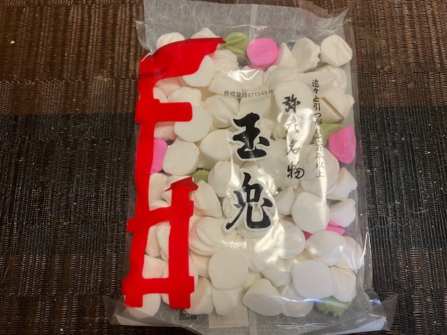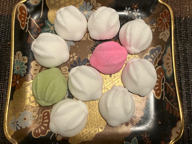 形状は正に「玉兎」。数個だけ色付き。食してみると、いわゆる落雁系で、口の中でサッと溶けて、優しいがすっきりした甘みが広がるのだ。正にお茶請けにピッタリの、上品で美味しいお菓子である🤤。