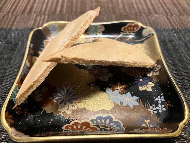 割ってみた感じ。煎餅としては、しっかり堅い部類である。食してみると、噛めば噛むほどいかの旨味が感じられる逸品。素朴かつシンプルながら、飽きのこない懐かしいふるさとの味という美味しさなのだ🤤。