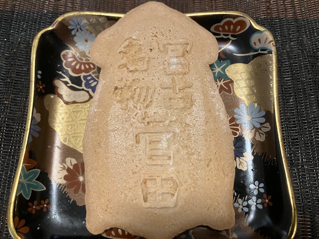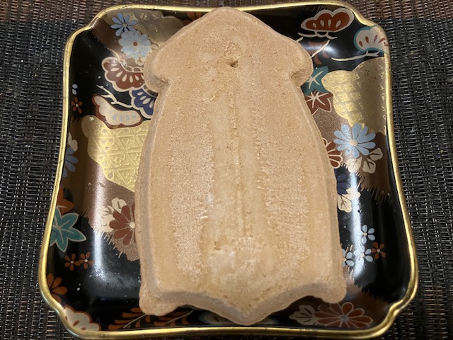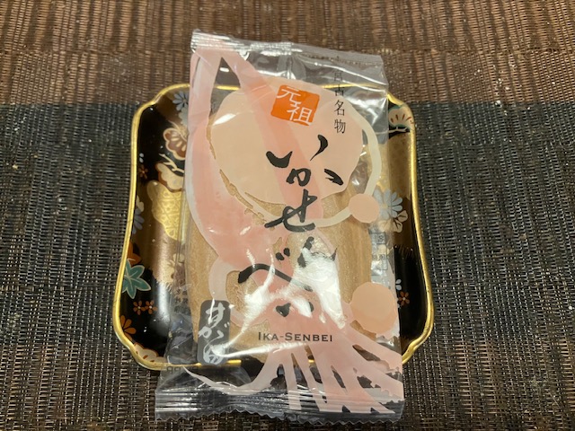 せんべいの形状はもちろん「いか」である。裏側にはお店の名前が大きく印字されているのだ😁。