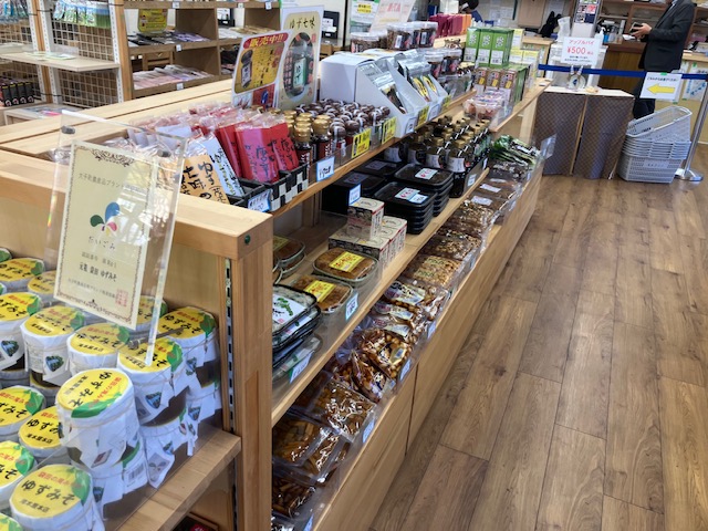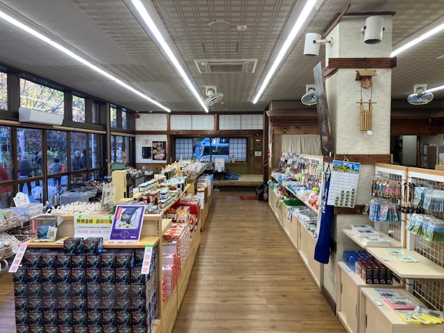 店内は、観光地によくある大きなお土産屋さんのレイアウトで、陳列台や壁面棚には各種おみやげ品がずらりと陳列されているのだ🙂。