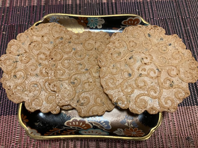 一袋3枚入りである。独特の唐草紋様が入っていて、非常に薄いのだ。食してみると軽い口当たりで、金胡麻と黒胡麻の風味がすぐに口の中に広がるのだ。一袋はあっという間になくなってしまう、お茶にピッタリの美味しいお煎餅なのだ🤤