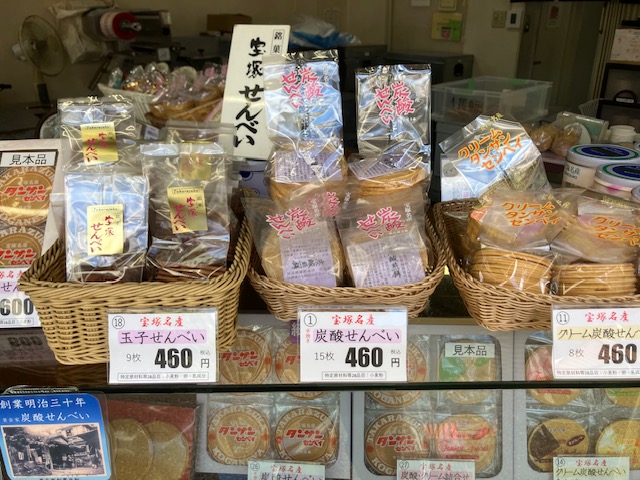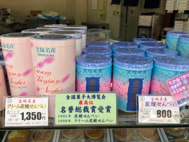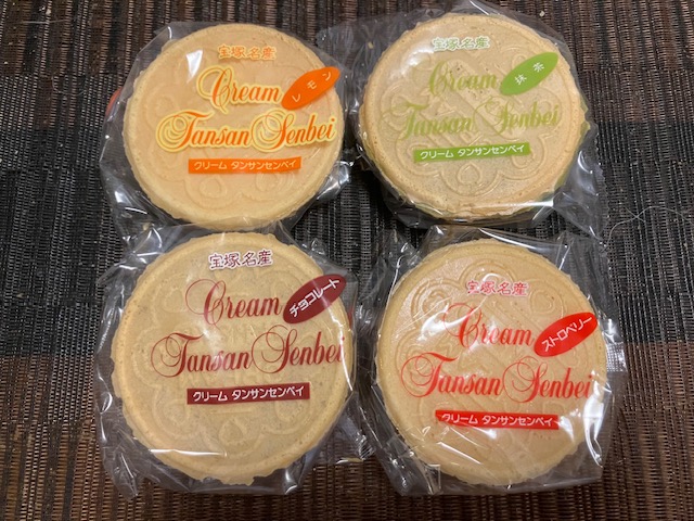 クリーム炭酸せんべいは4種類。宝塚せんべいは扇形の玉子煎餅である🤤。