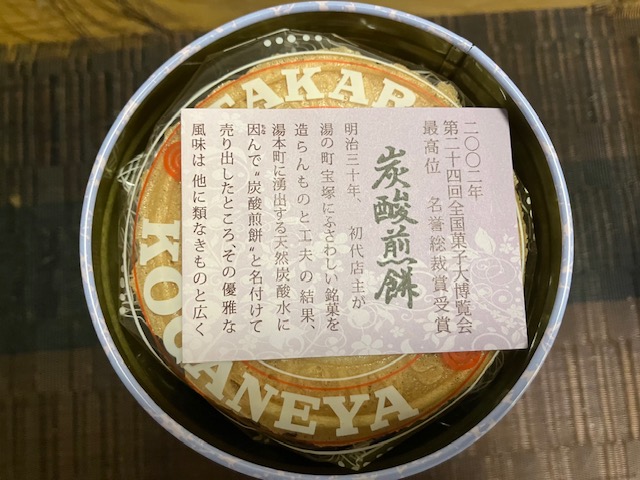 そして、こたパパと小太郎の全国100年老舗節約グルメ旅の事を知って大変驚かれたご主人は、何と一番大きなサイズの「炭酸せんべい」と「クリーム炭酸せんべい」、それに「宝塚せんべい」という商品まで袋に入れてプレゼントしてくれたのだ。有難いことである😌。