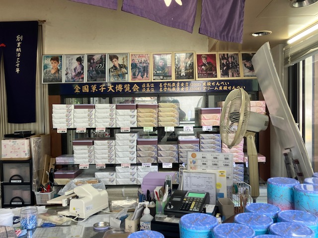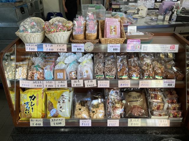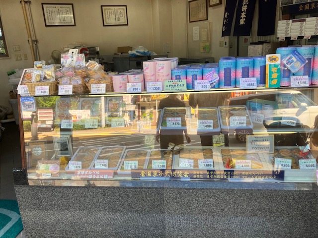 店頭のショーケース及び陳列台には、各種お煎餅類などがずらりと陳列されているのだ😁。