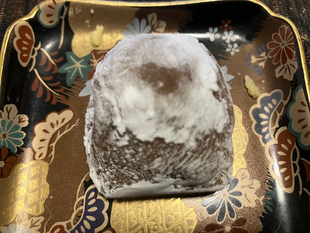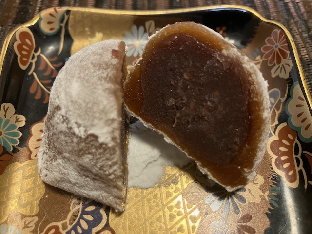 切ってみた感じ。まず驚くのは、持っただけで変形してしまうほどの求肥の柔らかさである。食してみると、さわやかな肉桂の香りと中のこしあんの甘さが絶妙なコントラストで口の中で溶けていく、非常に上品な味わいなのだ🤤。