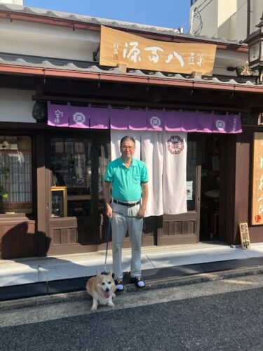 最後の小太郎記念写真を撮影しようとしたとき、お店の中から現六代目当主が出て来られたので、撮影にご協力頂いたのだ。このあと、少しお話しする時間があって楽しかったな。後継者についてはまだ未確定のようだったが、堺銘菓として名高い「肉桂餅」発祥のお店として、何とかその貴重な伝統を守って頂きたいと感じた、こたパパである😉。